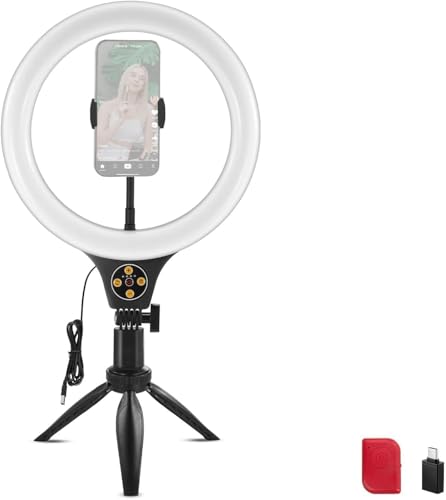 GOLDVIVER Anneau lumineux LED de qualité supérieure - 10" - Avec trépied, support pour téléphone portable et télécommande - 10 niveaux de luminosité et 3 couleurs.