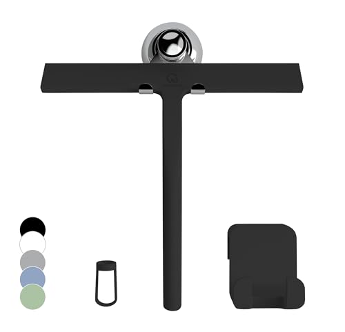 GÜTEWERK Raclette de Douche avec Support - Noir - Largeur : 23 cm - sans perçage - Raclette en Silicone - pour Douche, Salle de Bain, fenêtre - Noyau en Acier Inoxydable - avec Support à Ventouse