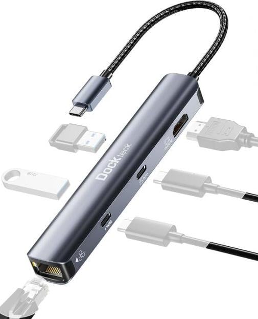 Hub USB C Dockteck 7-en-1 Dock DD0003 Adaptateur USB C, Ethernet LAN RJ45, 4K 60Hz HDMI, 100W Power Delivery, 2 ports USB 3.0 et SD/microSD pour iPhone 15 Pro MacBook M1, iPad Pro, Surface Pro et Plus