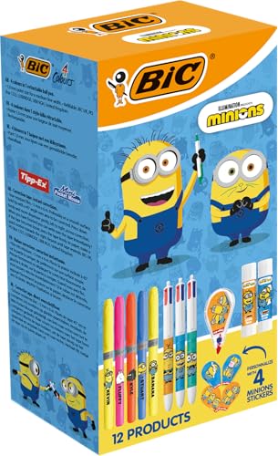 BIC Minions Kit de Papeterie Édition Limitée - 4 Couleurs Stylos-Bille Pointe Moyenne (1,0 mm)/Surligneurs Pointe Biseautée/Souris Correctrice 6 m/Bâtons de Colle/Autocollants - Boîte de 12