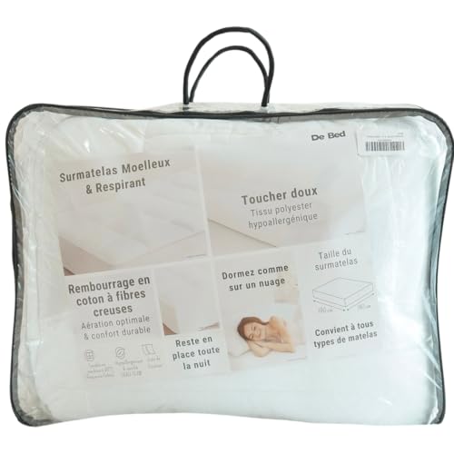 De Bed Surmatelas 140x190 Épaisseur 7 cm – Moelleux, Respirant et Hypoallergénique – Facile à Ranger avec Sac Inclus – Garnissage Coton, Housse Polyester avec Jupe Élastique