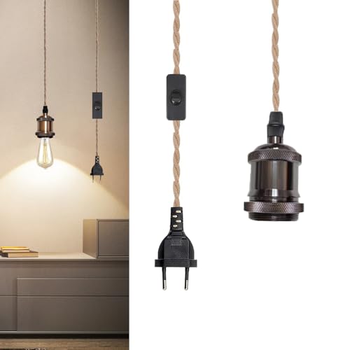 Chao Zan Douille E27 avec Câble 2m en Corde de Chanvre Tressée Suspension Luminaire en métal Vintage, Lustre Corde de Chanvre Rétro Interrupteur Kit Suspension Luminaire Cuisine Cave Loft Entrepôt (A)