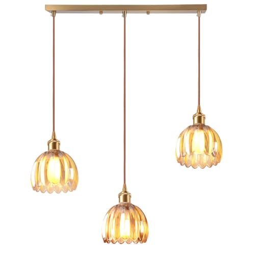 DLGLOLIN 3 Lampes Suspendue en Verre Intérieure Moderne Ambre Fleurs Suspension Luminaires Vintage Laiton Doré Lustre Plafonniers pour Cuisine Cuisine Salon Chambre