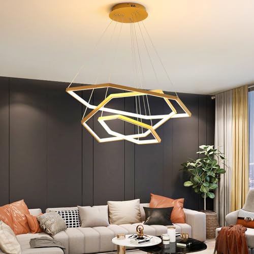 J.SUNUN Suspension Luminaire LED Moderne Salon Plafond Lampe 3 Anneaux Doré 90W 4500LM Lustre Suspendu Plafonnier Dimmable avec Télécommande pour Chambre Cuisine Salle à Manger Bureau 40×60×80CM