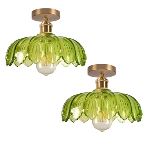 DLGLOLIN Lot de 2 Plafonnier Luminaire en Verre Verte Lampe de Plafond Créativité Fleur Décoratio E27 Laiton Éclairage de Plafond Suspension Pour Couloir Chambre Salle à Manger