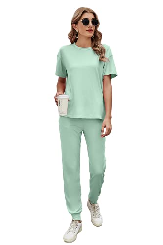 Ietaoo Coton Survêtements Femme Ensemble de Pyjama 2 Pièce Sportswear Jogging Col Rond T-Shirt et Pantalon Sweat Suit Tenue Sport Ensemble Vêtements de Nuit Vert S