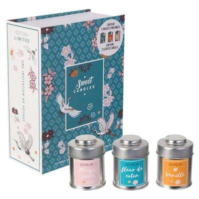 Home Deco Factory BO5372 Bougies Parfumées Sweet Coffret Livre de 3 Assorties Nuage Sucré Fleur de Coton Vanille Pots Métal Gris Rose Bleu Orange H23 x 8,5 x 17,6 cm
