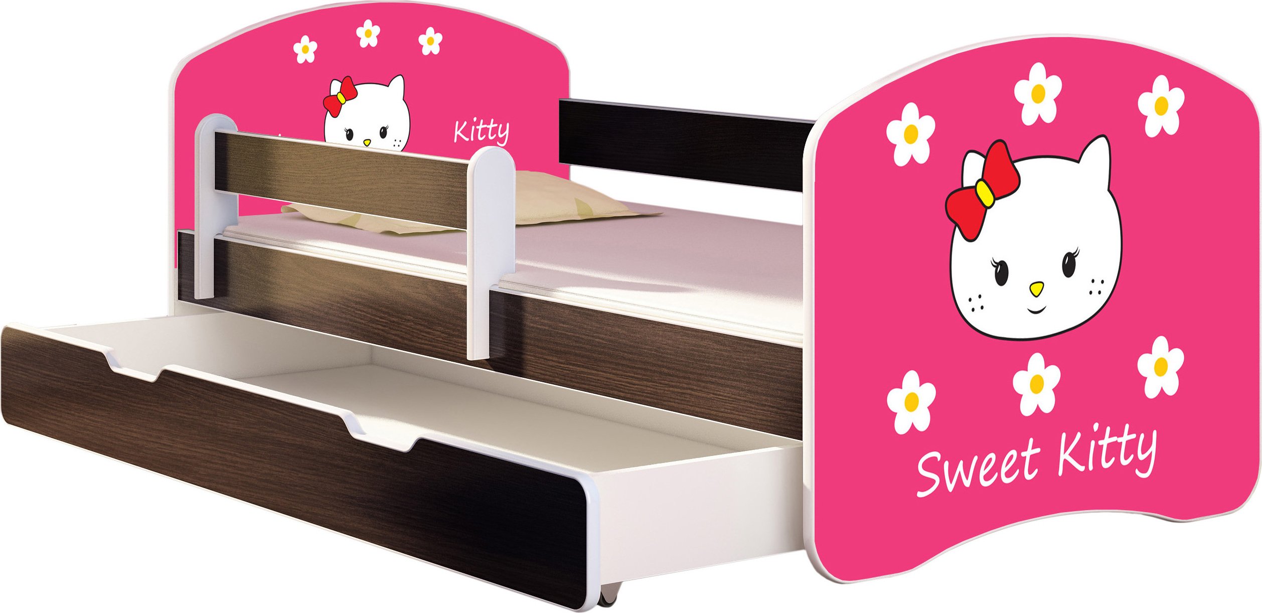 ACMA lit d'adolescent lit d'enfant lit junior set complet avec matelas sommier à lattes et protection contre les chutes wengé 16 Sweet Kitty 2 140x70 + coffre de lit