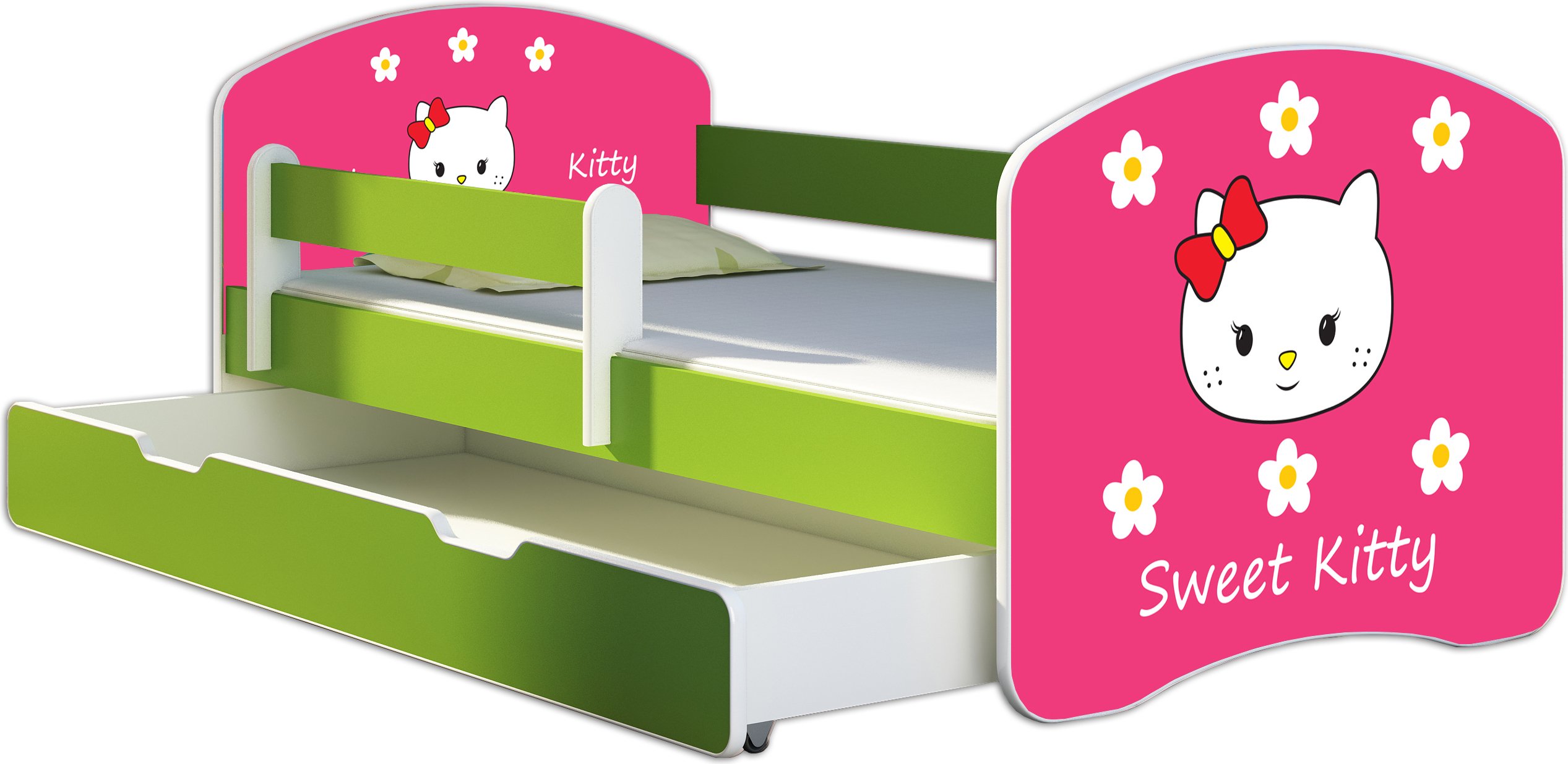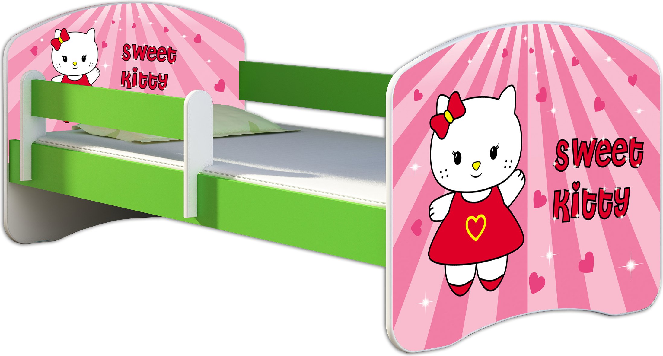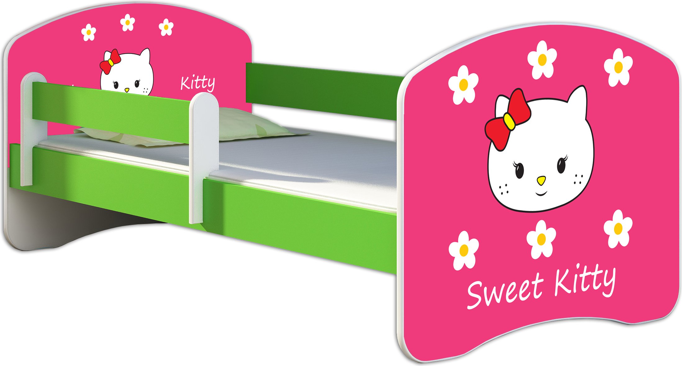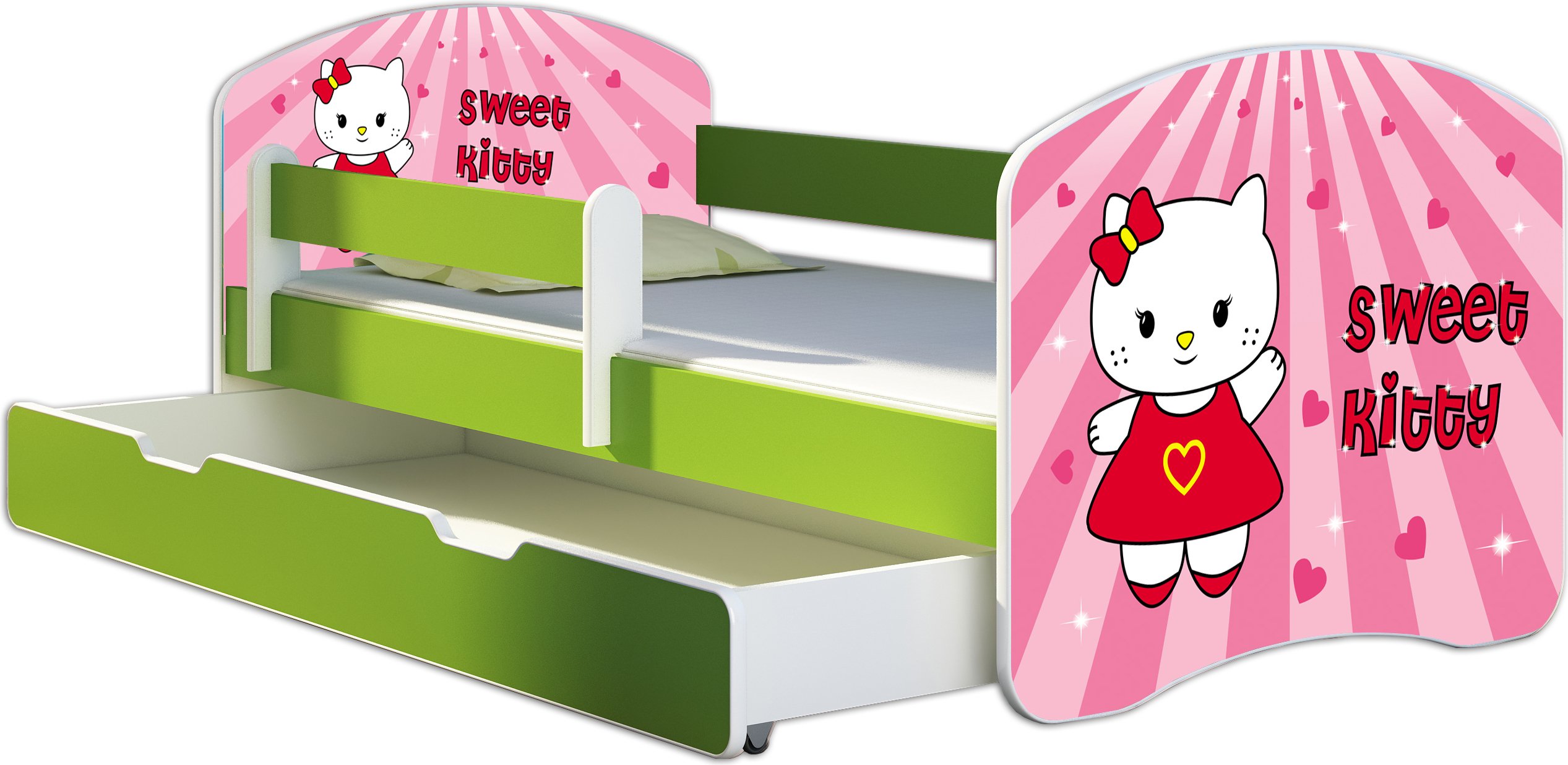 ACMA lit d'adolescent lit d'enfant lit junior set complet avec matelas sommier à lattes et protection antichute vert 16 Sweet Kitty 2 180x80 + coffre de lit