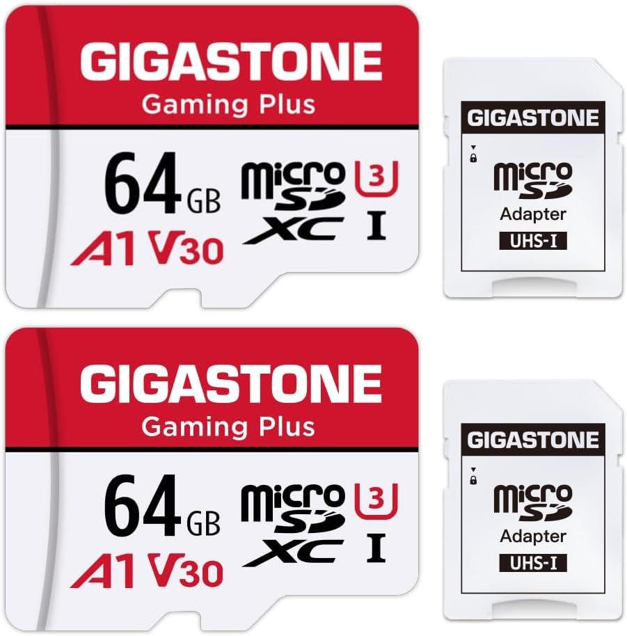Gigastone Carte Mémoire 64 Go Lot de 2 Cartes, Gaming Plus Série, Vitesse de Lecture allant jusqu'à 95 Mo/s. A1 U3 V30 Carte Micro SDXC pour Nintendo Switch Caméra Full HD vidéo avec Adaptateur SD.