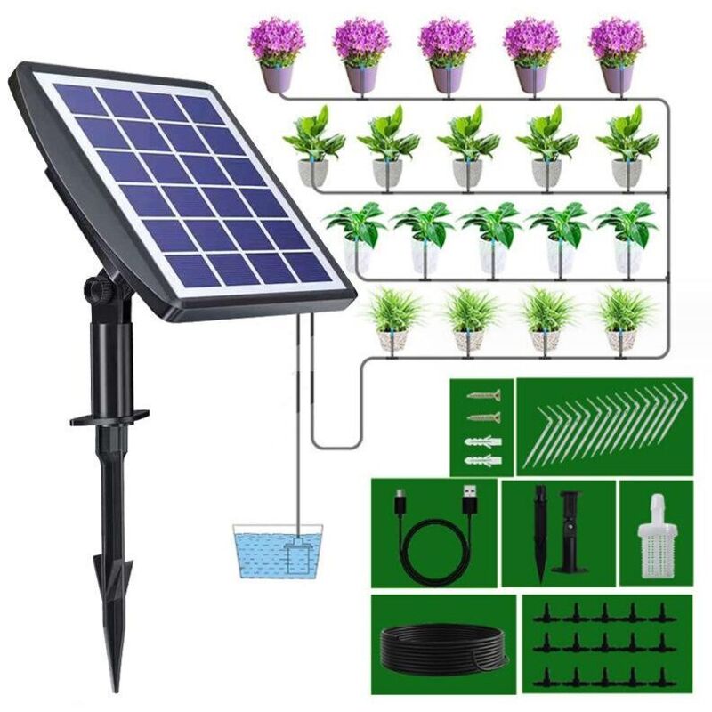 Systeme d'arrosage automatique solaire, Kit d'irrigation goutte a goutte, avec minuterie Pour balcons, terrasses, jardins..