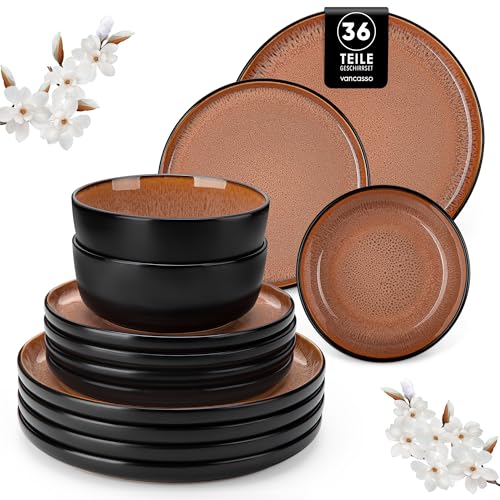 vancasso AMBER Service de Table 12 Personnes, Set Vaisselle 36 Pièces en Grès - Assiettes Plates, Assiettes à Dessert et Bols - Adapté au Micro-Ondes, Glaçure Rouge