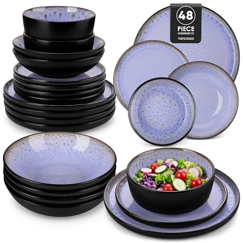 vancasso AMBER Service de Table 12 Personnes, Set Vaisselle 48 Pièces en Grès - Assiettes Plates, Assiettes à Dessert, Bols à Pâtes et Bols - Adapté au Micro-Ondes, Glaçure Violette