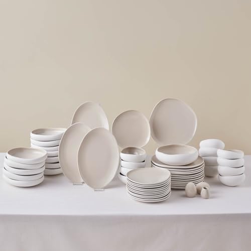 Karaca New Cupid Assiettes Service de Table 12 Personnes de 55 pièces, Résistant au lave-vaisselle et au congélateur, Ensemble Vaisselle en Gres, Earth Collection, Crème