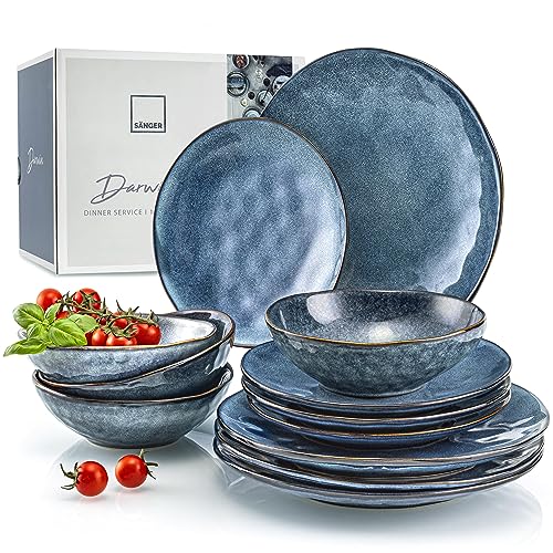 SÄNGER Darwin Service de table, 12 pièces, en faïence, pour 4 personnes, bleu avec assiettes plates, assiettes à dessert et assiettes creuses, vaisselle en faïence, set de vaisselle fait main |