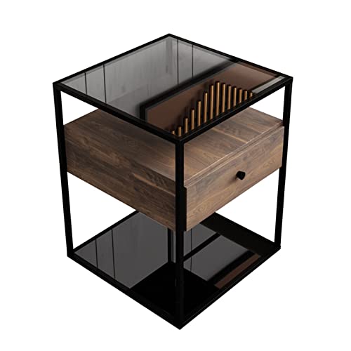 Table de Chevet en Verre Trempé, Table d'appoint Haute de Table de Nuit, Table d'appoint de Style Simple Moderne avec tiroir et étagère, Table Basse à Cadre en métal,A