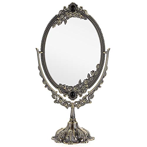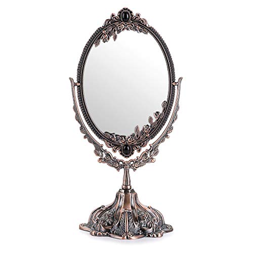 JUXYES Miroir de Maquillage décoratif de Table en métal avec Support, Miroir cosmétique Double Face pivotant Vintage avec Cadre, Miroir Ovale rétro pour Salle de Bain, Chambre à Coucher