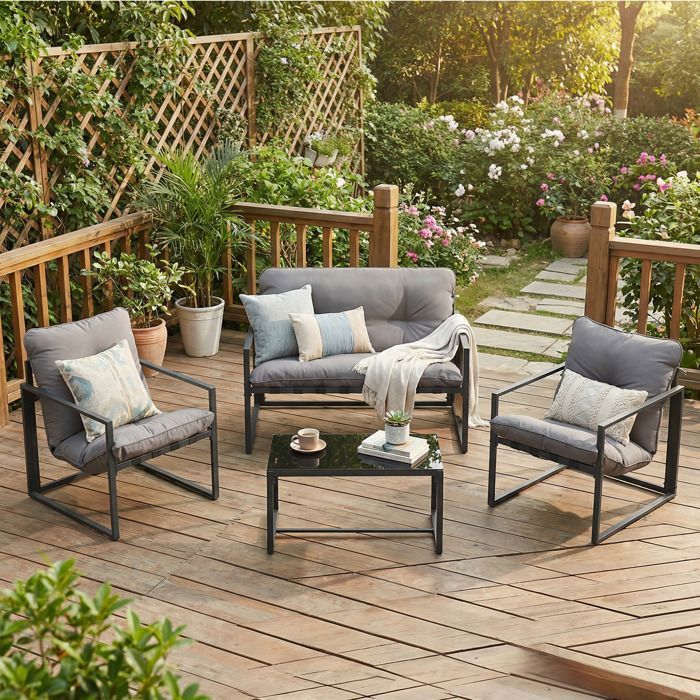 Ensemble table et chaise de jardin 4 Places avec Coussins Rembourrés Acier pour Balcon Terrasse Gris