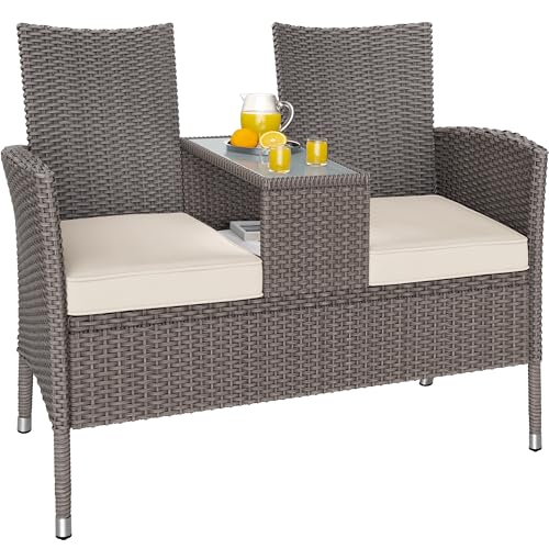 Banc de Jardin en polyrotin 2 Places avec Coussins Table intégrée 143 x 55 x 88 cm Salon de Jardin extérieur crème