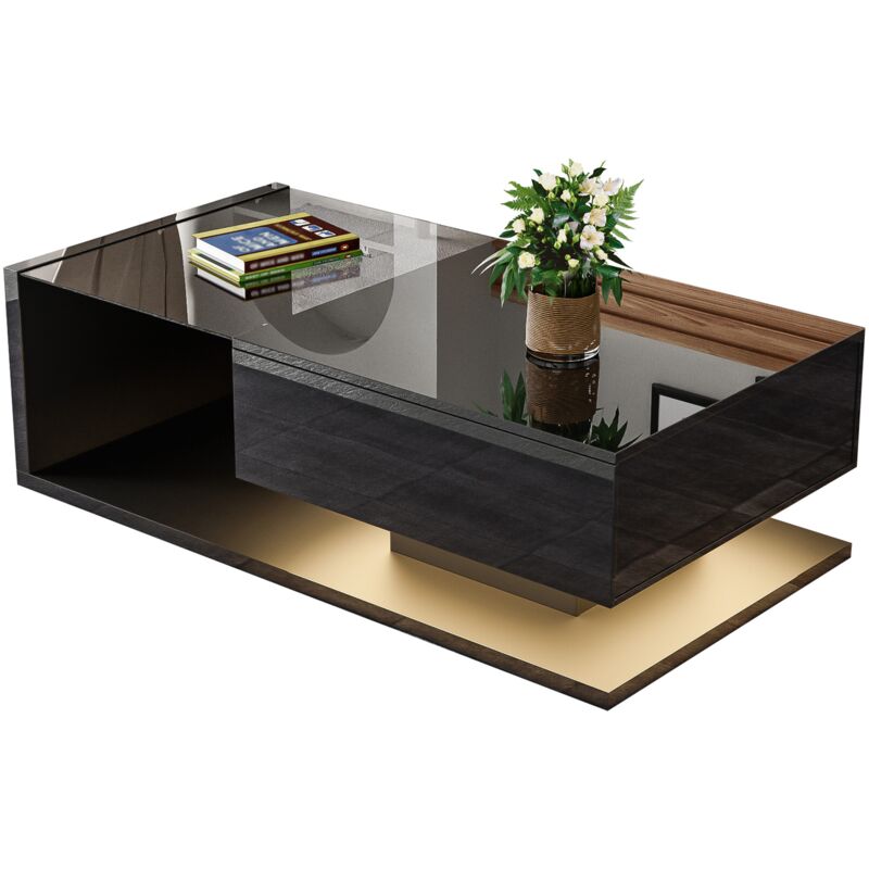 Table basse moderne 100 cm, avec tiroir et étagères, éclairage LED, Surface laquée brillante, Étagères et plateau en verre de sécurité - Noir