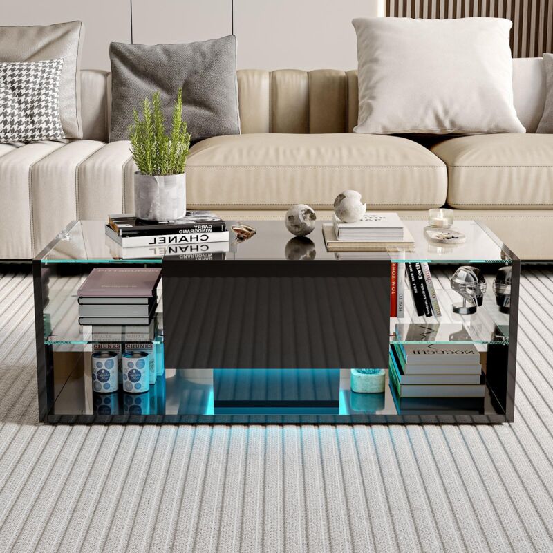 Table basse en verre moderne 100x50x40cm LED Table à thé Compartiment rangement Multiple Noir brillant