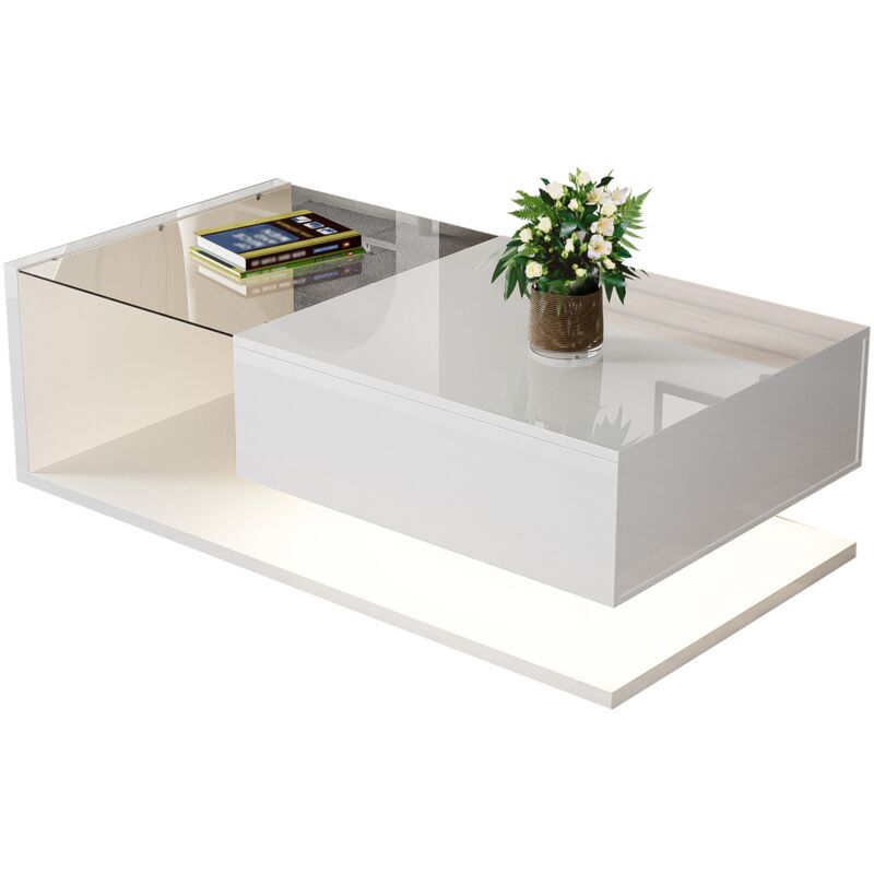 Table basse blanc brillant 100x50x32 cm - avec plateau et tiroirs en verre, anti-rayures, avec 1 tiroir, avec éclairage led, style moderne