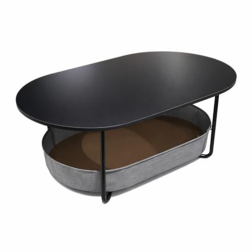 Relaxdays Table Basse Ovale avec Panier en Tissu, Rangement, MDF et métal, 55x100x45 cm, Noir-Gris foncé