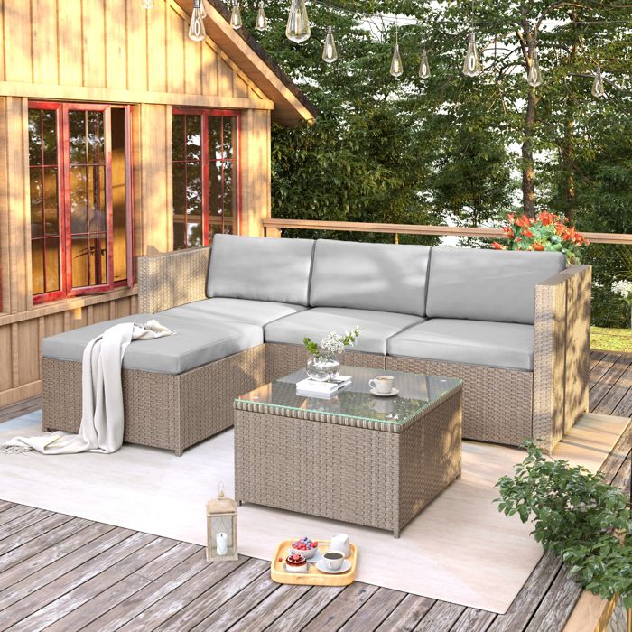Flieks Gartenlounge-Set 5 Teilig, Ensemble de meubles de balcon avec table de jardin pour 6 personnes, Canapé de jardin avec canapé d'angle & chaise, Table basse avec plateau en plastique, Gris