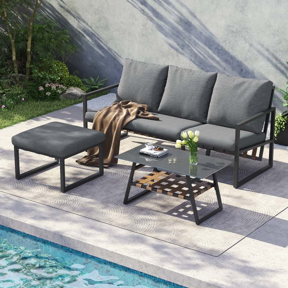 AIORBER Ensemble de meubles de jardin, ensemble d'angle avec canapé,table basse & tabouret de pied, tube d'acier galvanisé,plateau de table en verre,pour jardins,piscines,182,5x74x79cm, gris