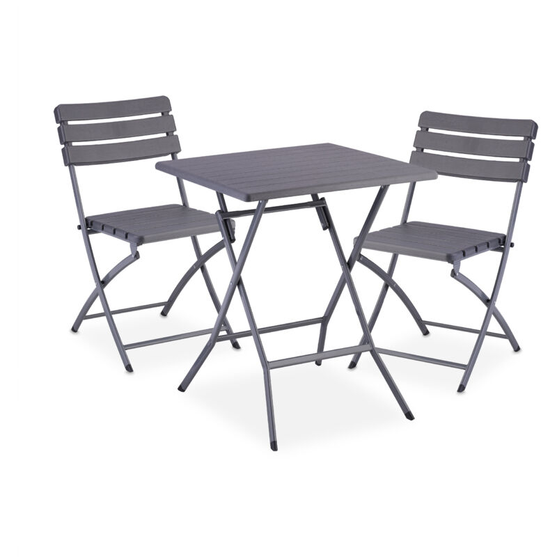 Table pliante et 2 chaises pour balcon, aspect bois, acier et plastique, meubles terrasse, grises - Relaxdays