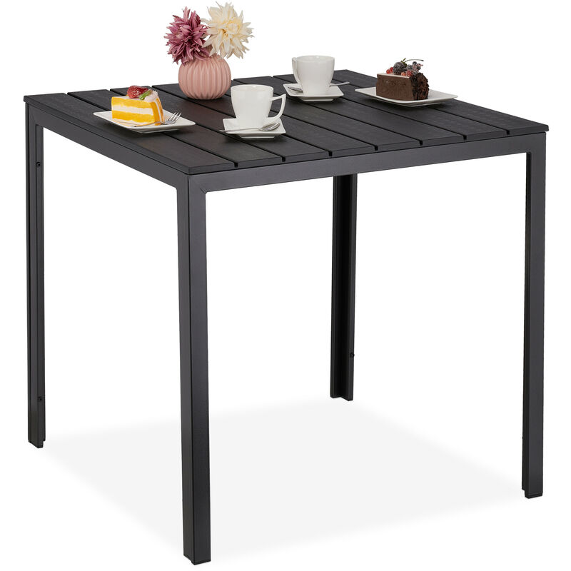 Relaxdays - Table de jardin, aspect bois, plastique et acier, carrée, h x l x p : 74 x 78 x 78 cm, balcon, terrasse, noire