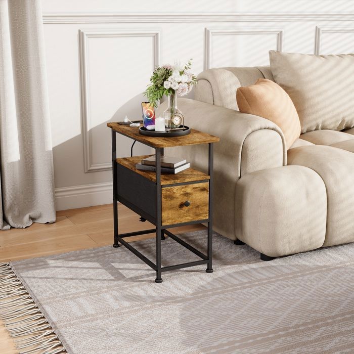 Table dAppoint Bout de Canape avec CA et Ports USB à lIntérieur Table dAppoint Canapé avec Tiroir de Rangement Marron