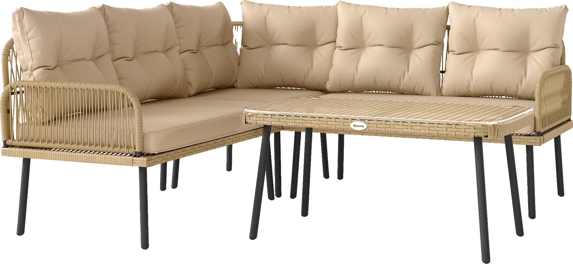 Outsunny Salon de jardin extérieur en résine tressée 5 places, canapés 2 places, chaise d'angle, table en verre trempé et coussins inclus, mobilier de jardin pour terrasse balcon, effet bois naturel