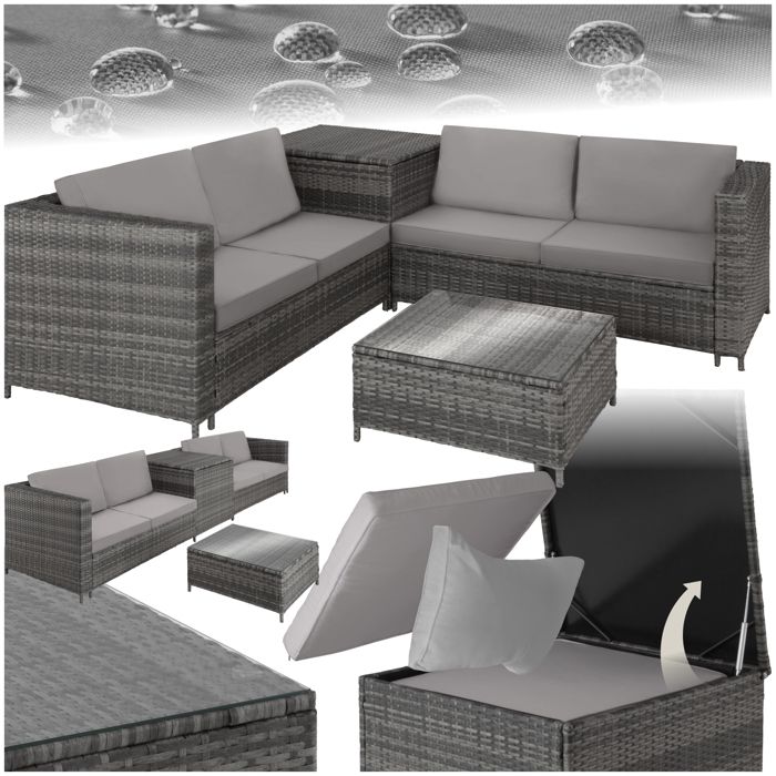 Ensemble table chaise de jardin - TECTAKE - Canapé de jardin PISE 5 places en rotin avec coffre de rangement coussins - Gris