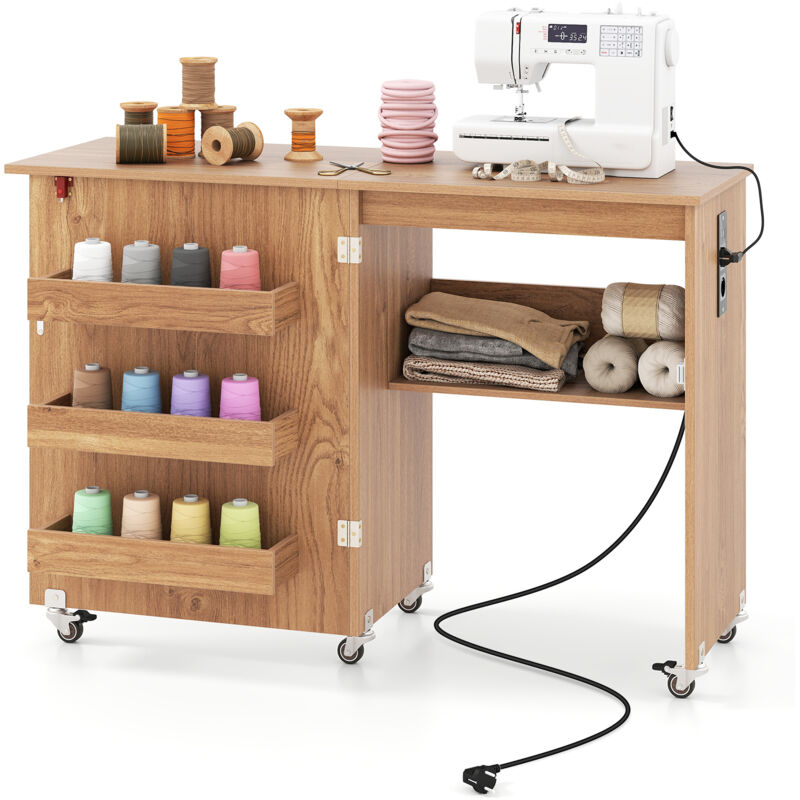 RELAX4LIFE Table de Couture Pliante avec Station de Charge, 2 Prises-Port USB-Type C, 3 Compartiments, 5 roulettes, Meuble Machine à Coudre pour Aiguilles, Fils et Ciseaux (Brun)