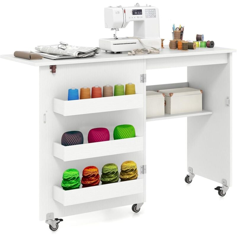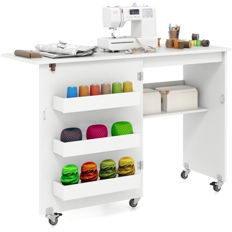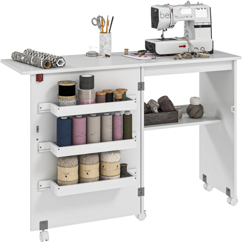 Table de couture pliante meuble couture à abattant avec bacs de rangement, étagère ouverte et roulettes, blanc