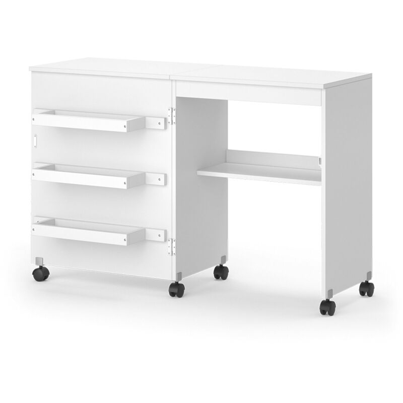 Table de couture pliante meuble couture à abattant avec bacs de rangement. étagère ouverte et roulettes. blanc