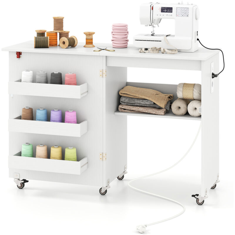 RELAX4LIFE Table de Couture Pliante avec Station de Charge, 2 Prises-Port USB-Type C, 3 Compartiments, 5 roulettes, Meuble Machine à Coudre pour Aiguilles, Fils et Ciseaux (Blanc)