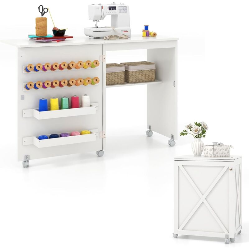 RELAX4LIFE Table de Couture Pliable avec Grand Plateau, 3 Compartiments, Étagère de Rangement, Meuble Gain de Place à roulettes pour Aiguilles, Fils et Ciseaux(Blanc)