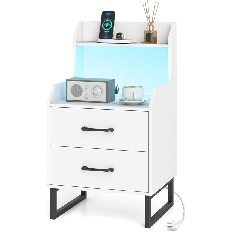 Table de Chevet avec LED - RELAX4LIFE - Prise Intégrée - Port USB et Type-C - 2 Tiroirs et Étagères Ouvertes - 45X35X725CM - Blanc