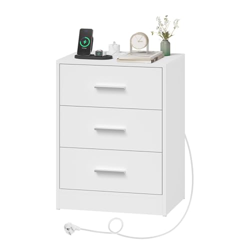 WOLTU Table de Chevet avec Prise Intégrée, Table d'Appoint avec Station de Charge, 3 Tiroirs, 2 Prises AC, 1 Port USB, 1 Port Type-C, Blanc, 39x28,5x54,5cm