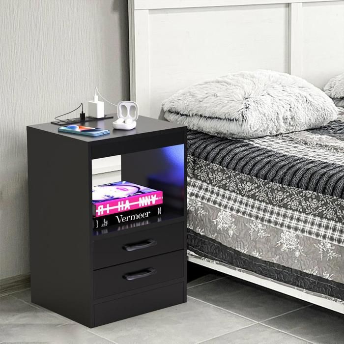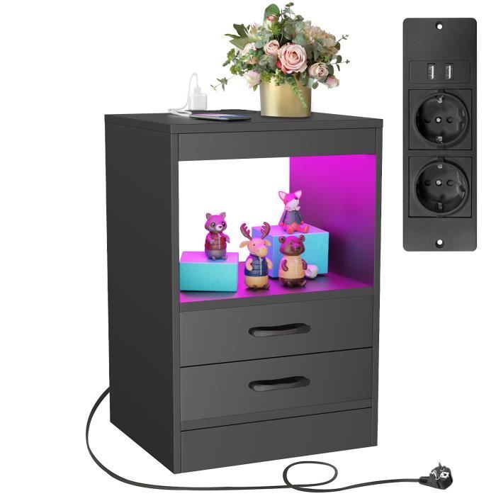 DHHOZAMZ Table de nuit LED - 2 Tiroirs - Noir - Table de Chevet avec Prise et Port USB - L 40 x P 35 x H 60 cm