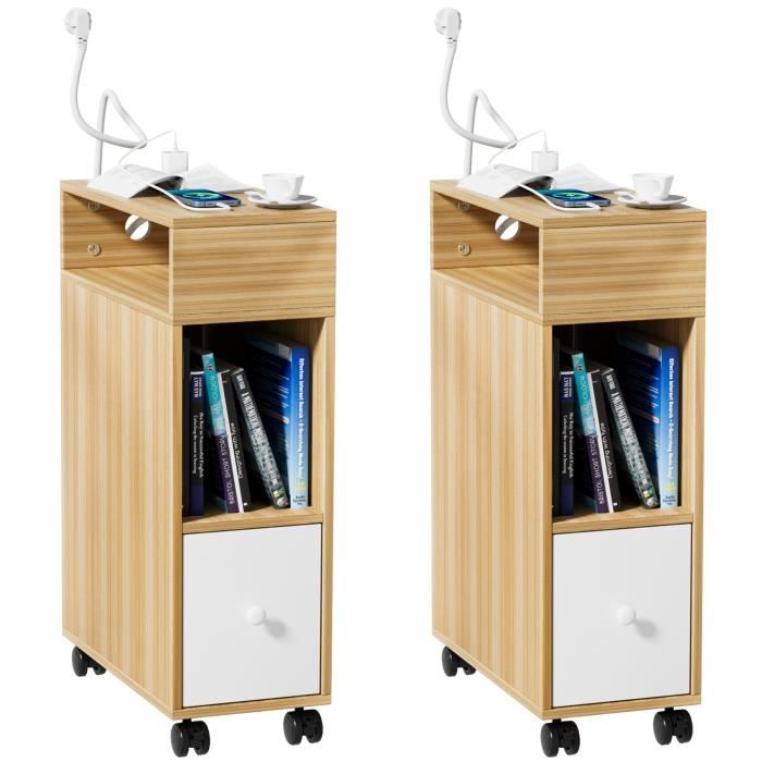Table de Chevet Étroite avec prise et USB - VIVOLILV - Lot de 2 - 1 Tiroir - 2 Compartiments Ouverts - beige