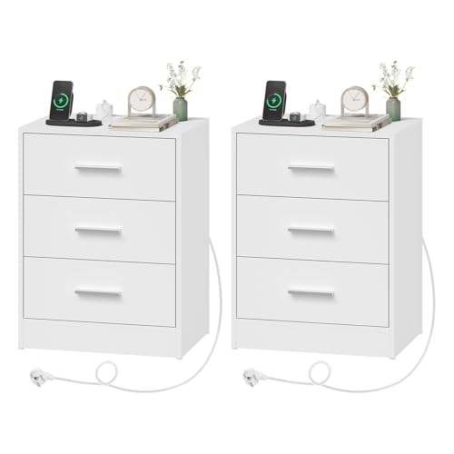 WOLTU Table de Chevet avec Prise Intégrée, Lot de 2, Table d'Appoint avec Station de Charge, 3 Tiroirs, 2 Prises AC, 1 Port USB, 1 Port Type-C, Blanc, 39x28,5x54,5cm