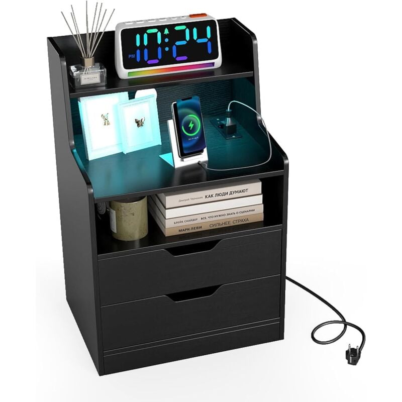 Table de chevet-Avec un tiroir et un compartiment ouvert-LED Multicolore Réglable-1 prise secteur et 2 ports USB-40x30x30cm-noir