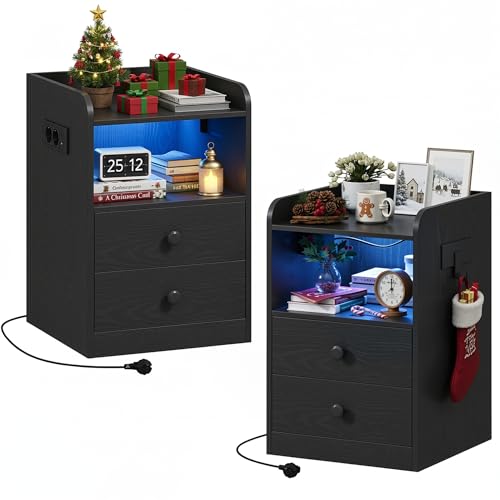 IRONCK Table de Chevet Lot de 2 avec Prise et LED, Table d’Appoint avec 1 Port USB et 1 Port de Type C, Table de Nuit Lot de 2 avec 2 Tiroirs pour Salon et Compartiment Ouvert, Chambre, Bureau, Noir