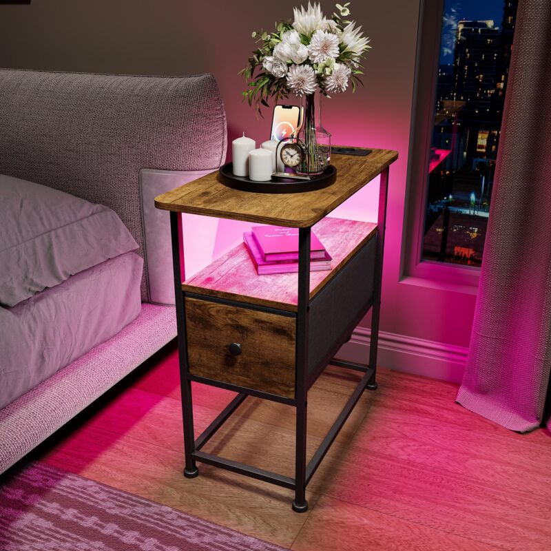 Table d'appoint avec Prise Électrique et USB C, Table de Chevet LED, Bout de Canapé avec Tiroir, Station de Charge Intégrée, Rangement 3 Niveaux,