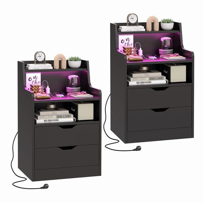 PIPIPOXER Lot de 2 Table de chevet avec Prise et ports USB2 tiroirs et 1 nicheÉclairage LED Réglable45x35x72 cmNoir