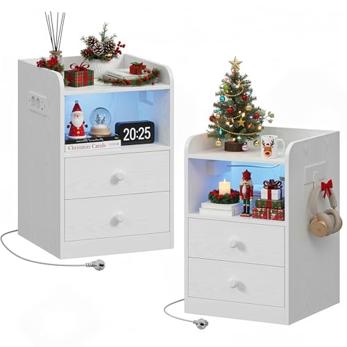 IRONCK Table de Chevet Lot de 2 avec Prise et LED, Table d’Appoint avec 1 Port USB et 1 Port de Type C, Table de Nuit Lot de 2 avec 2 Tiroirs pour Salon et Compartiment Ouvert, Chambre, Bureau, Blanc