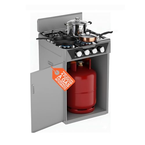 Avilia – Table de cuisson 4 feux à gaz avec compartiment porte-bouteille intégré, cuisine à installation libre pour intérieur et extérieur, structure robuste compacte et facile à utiliser blanc (gris)